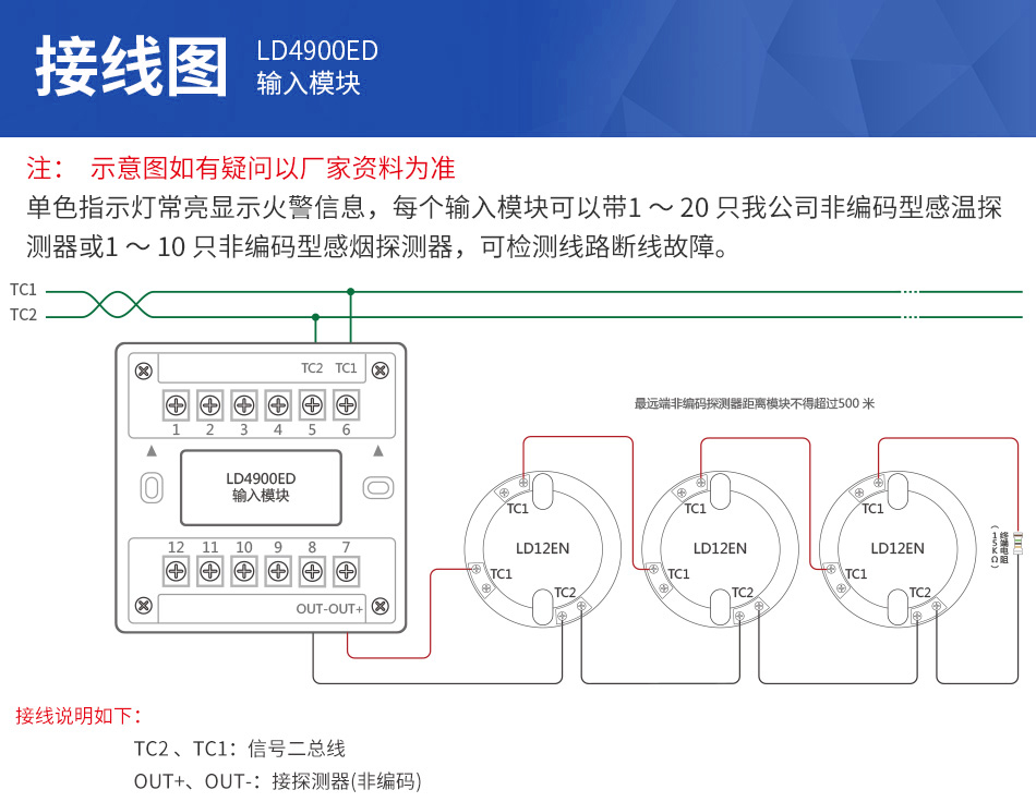 1、LD4900ED輸入模塊為二總線,無極性。 2、采用電子編碼,占一個節點地址(0~255)。 3、單色指示燈常亮顯示火警信息。 4、每個LD4900ED輸入模塊可以帶1~20只利達公司非編碼型探測器。 5、LD4900ED輸入模塊可檢測線路斷線故障。