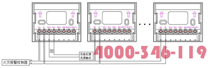“S+”、”S-”為總線端子,接入火災報警控制器;“IN1+”、“IN1-”接現場設備無源觸點的常開或常閉開關量信號,同時在被控設備的常開觸點上直接并接一個10K終端電阻。